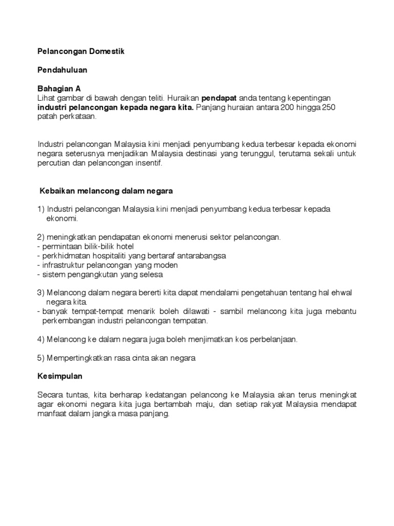 Pada tahun 2000 seramai 102 juta orang pelancong termasuk pelancong domestik berkunjung ke Malaysia yang menghasilkan pendapatan RM20 bilion termasuk RM17 bilion daripada pertukaran. Tema pelancongan karangan bahagian a spm kssm sahabat anda dari australia bertanyakan tentang industri pelancongan di malaysia menerusi e mel. ALOR SETAR - Pembangunan semula kawasan rekreasi Titi Hayun dan Batu Hampar di daerah Yan yang terjejas akibat fenomena kepala air Ogos lalu akan.