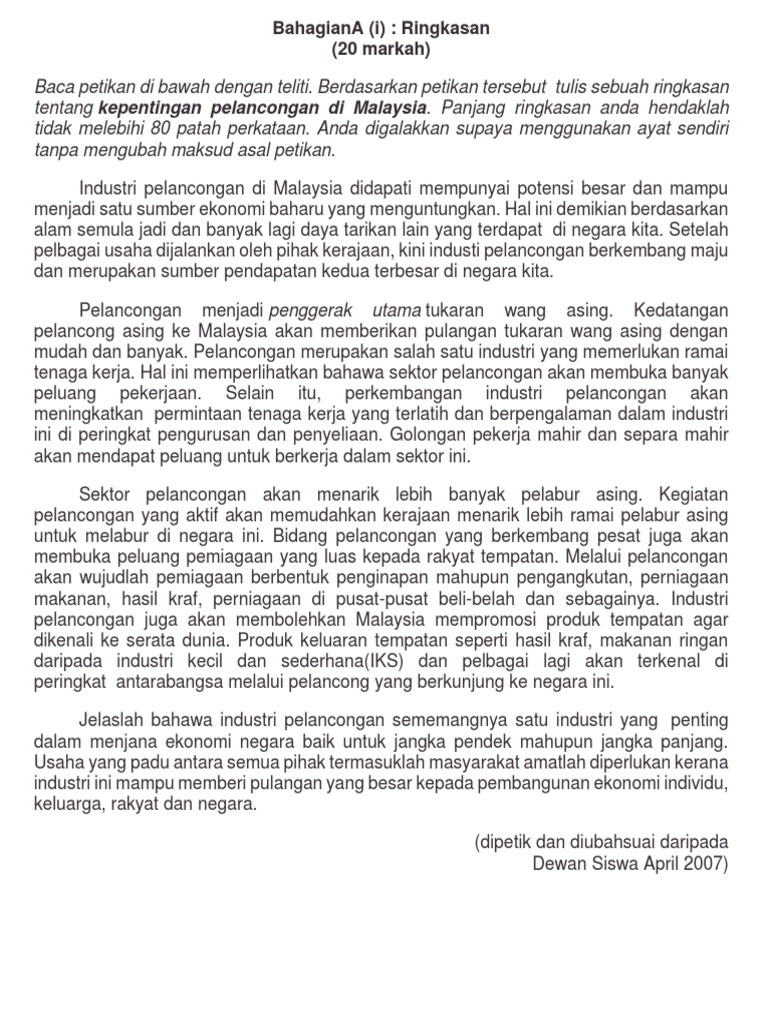 Pelancongan hijau merupakan sub-sektor industri pelancongan yang paling berkembang. Di samping itu sektor pelancongan dapat memperkenalkan dan mengembangkan industri kraf tangan di Malaysia. Tema pelancongan karangan bahagian a spm kssm sahabat anda dari australia bertanyakan tentang industri pelancongan di malaysia menerusi e mel.