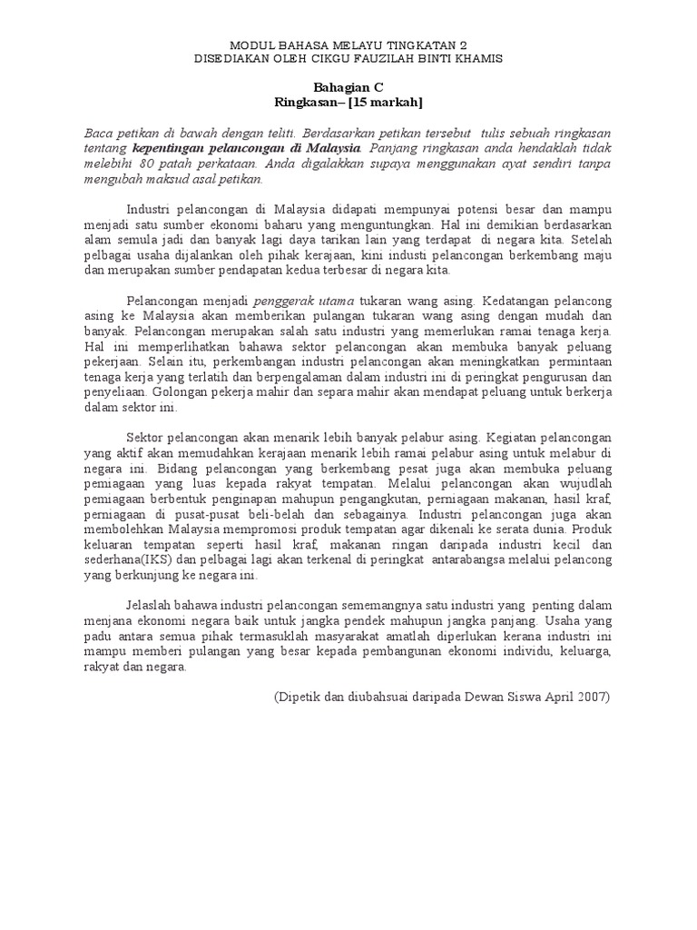 Panjang ringkasan anda hendaklah tidak melebihi 80 patah perkataan. Karangan jenis ini menghendaki anda melaporkan sesuatu peristiwa yang didengar atau dilihat. Hal ini terbukti apabila Kementerian Pelancongan melaporkan bahawa sebanyak 30 juta pelancong asing telah berkunjung ke Malaysia pada tahun 2011 dan berjaya.