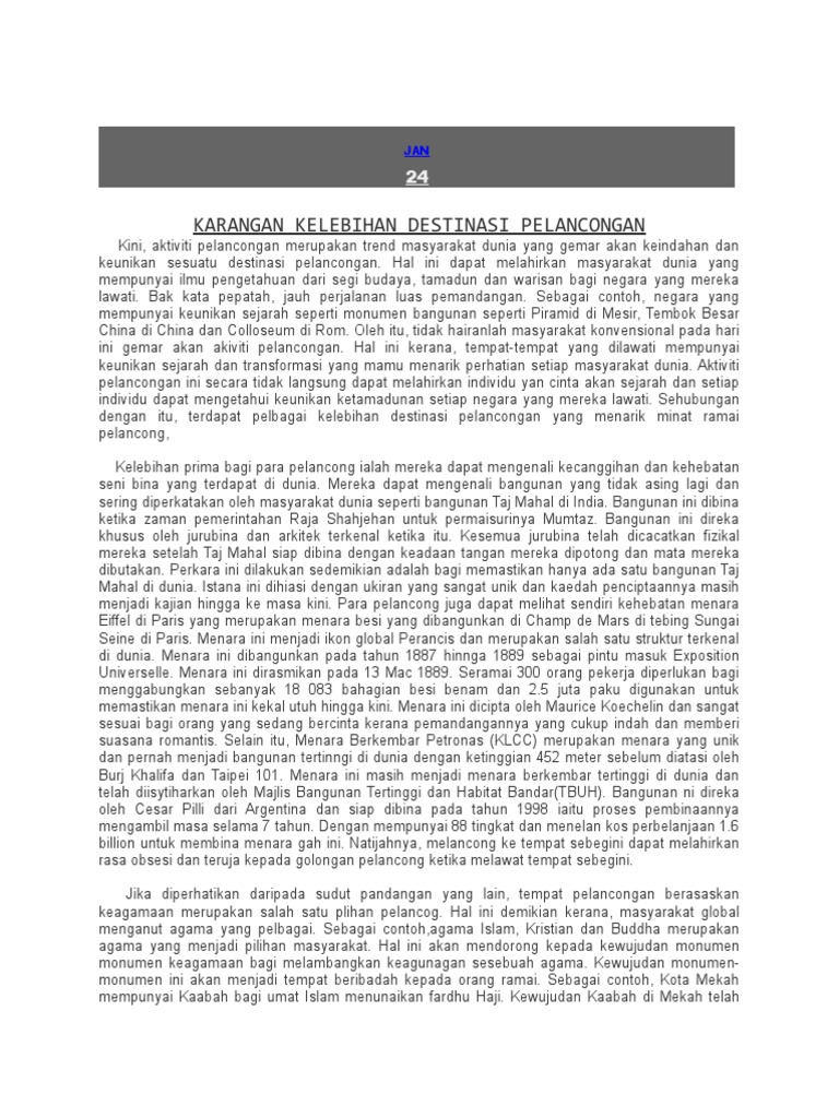 Malaysia juga terkenal dengan destinasi hub halal dan menjadi tumpuan pelancong asing terutamanya Asia Barat Timur Tengah dan Asia Tenggara. Contoh contoh karangan spm huraikan pendapat anda tentang cara cara mengamalkan gaya hidup sihat. Rencana hendaklah ditulis mengenai usaha-usaha atau insitiatif yang diambil untuk memajukan sektor pelancongan di Malaysia.