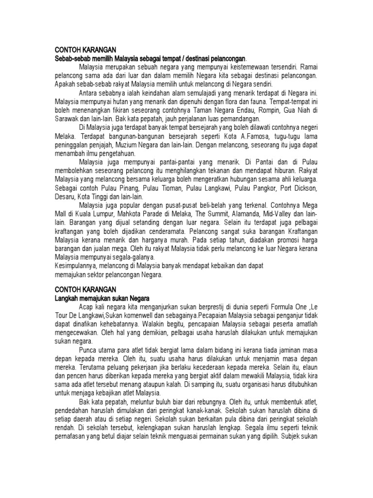 Pendahuluan TIA a Takrif - Industri pelancongan memang merupakan suatu sektor yang penting bagi sesebuah negara. Lihat gambar di bawah dengan teliti. Koleksi Contoh Karangan SPM Bahasa Melayu Sijil Pelajaran Malaysia Berikut adalah contoh-contoh karangan mengikut tema yang selalu digunakan sebagai tajuk soalan karangan Bahasa Melayu.