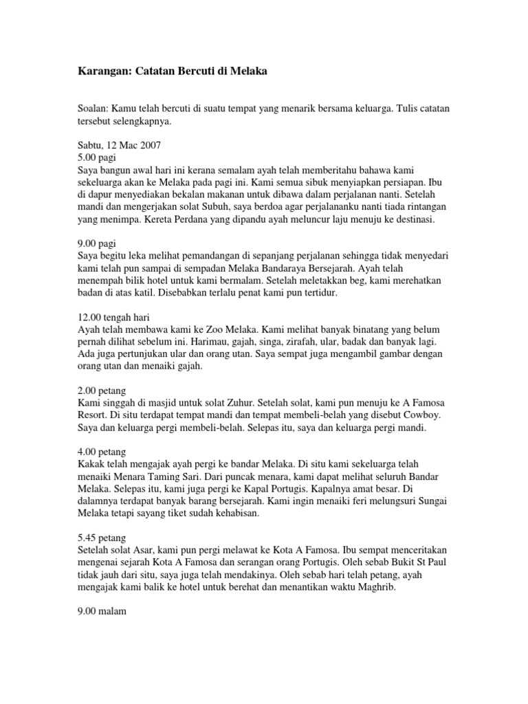 Sebelum bertolak ke sana kami diminta berkumpul di dataran sekolah seawal pukul 730 pagi. Malaysia merupakan sebuah negara yang bertuah kerana mempunyai banyak tempat yang. PERCUTIAN SAYA DI MELAKA CONTOH KARANGAN Pada minggu lepas saya dan keluarga saya telah pergi bercuti di Melaka.